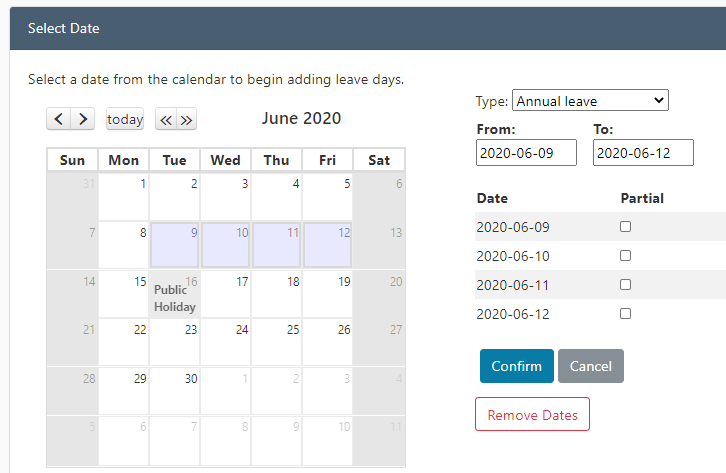 If you recorded a group of 4 leave days initially and now click Remove Dates, it will delete the entire grouping of 4 days. Therefore, if you wish to cancel only 1 day, you will first have to delete the entire grouping, and then re-record the 3 leave days that were actually taken.
